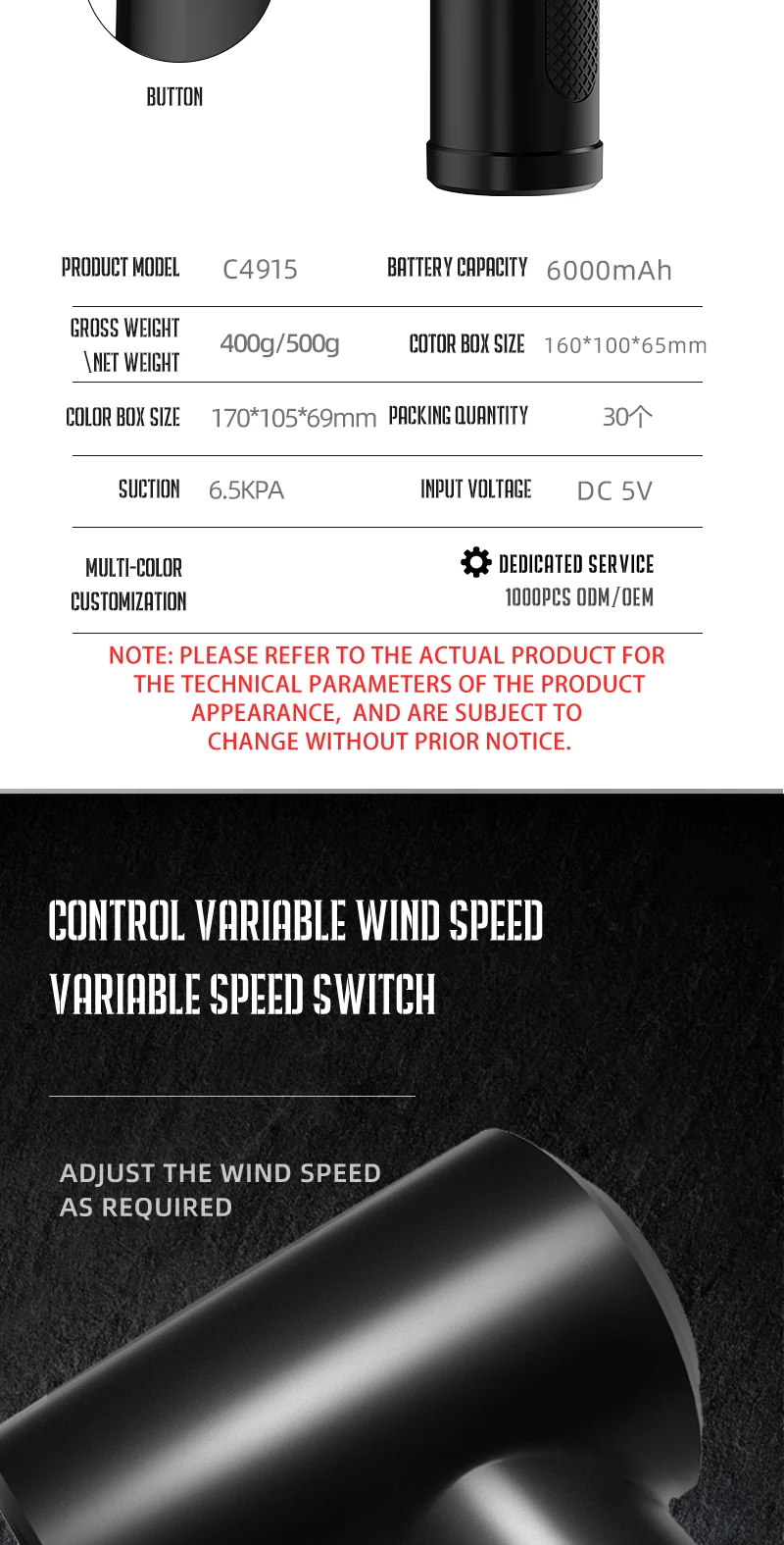 • Portátil e sem fio:O design sem fio deste soprador de ar facilita o uso em qualquer lugar, enquanto seu tamanho compacto permite armazenamento e transporte convenientes.