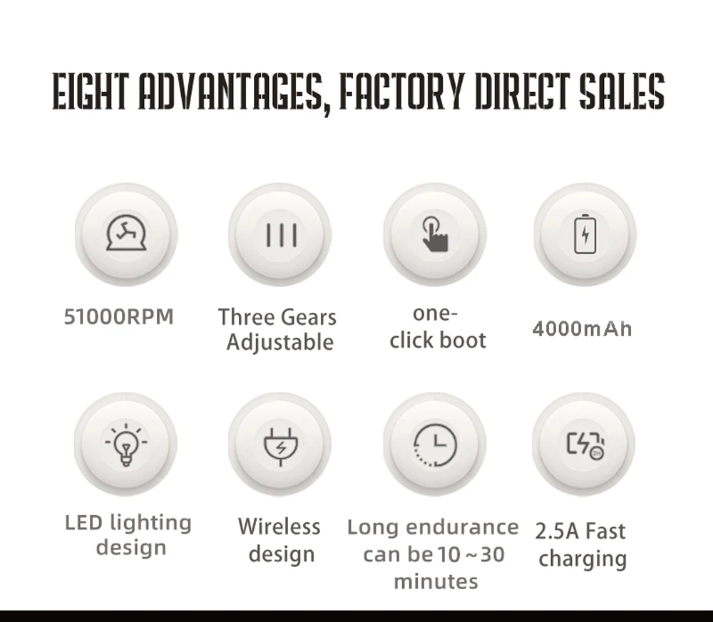 51000RPM/Três Engrenagens Ajustável/boot com um clique/4000mAh/design de iluminação LED/design Sem fio/Longa resistência pode ser 10 ~ 30