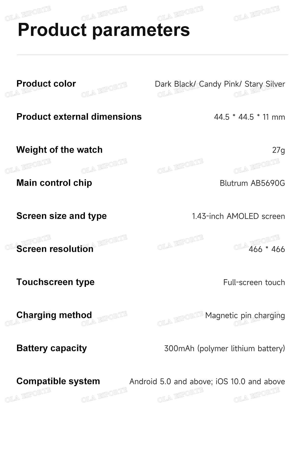 * Tela: 1,43 polegadas, resolução 466*466